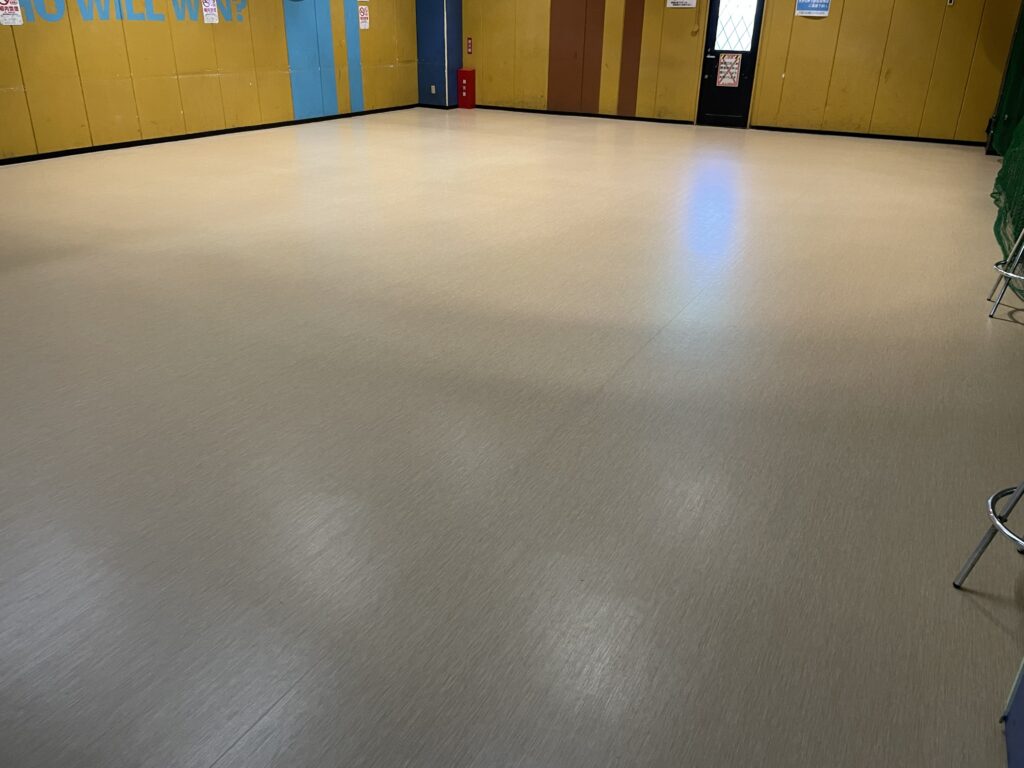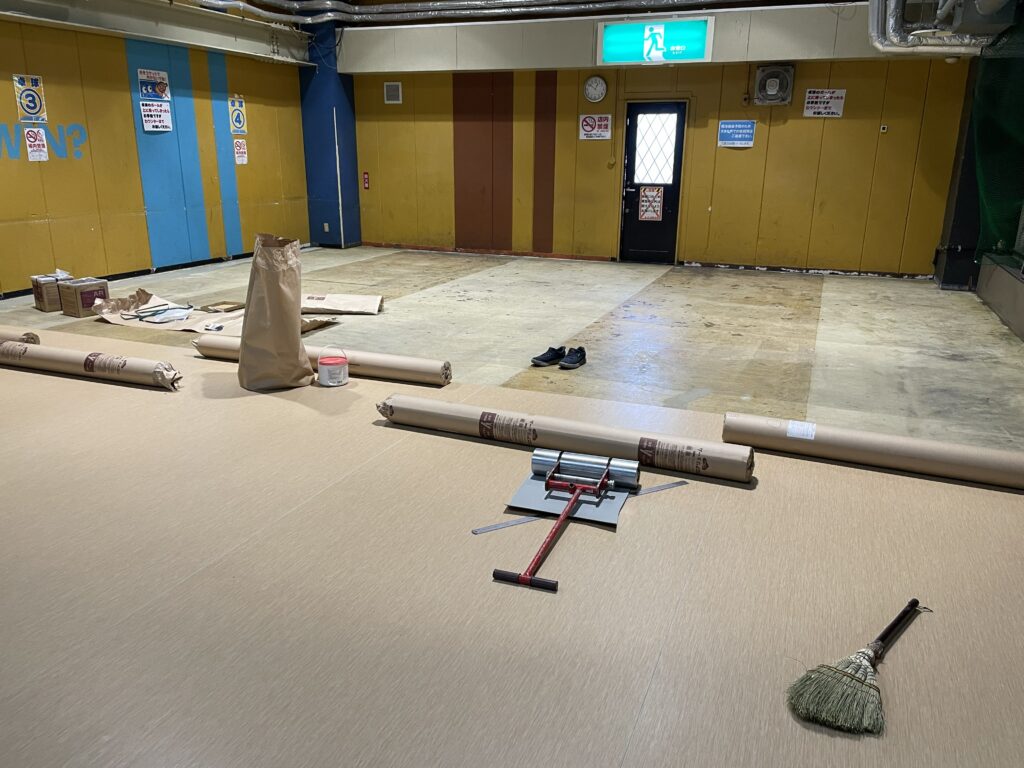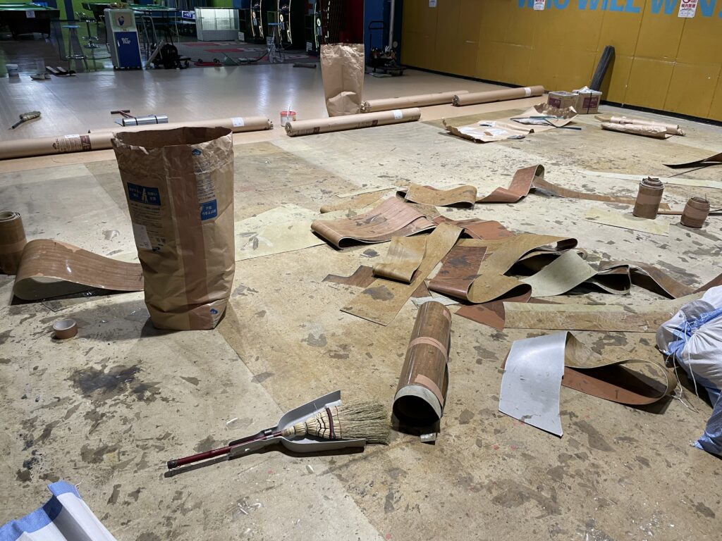 ゲームセンターの卓球場の床を貼り替えさせていただきました。床が綺麗になった卓球場でプレーを楽しんでください。(施工後写真と施工中写真)