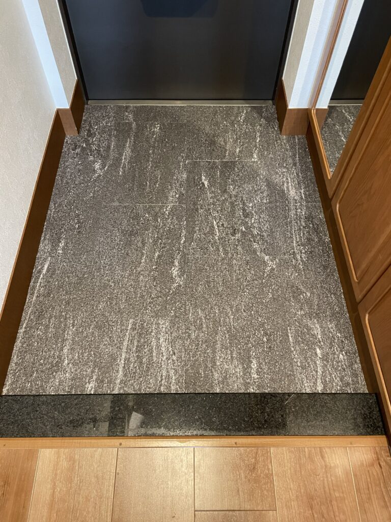 玄関土間の貼り替え工事を行いました。毎日出入りする玄関は住まいの第一印象を決める大切な空間です。経年による汚れや痛みが見られた土間を既存の状態を確認しながら、用途に合った材料で貼り替えを行いました。